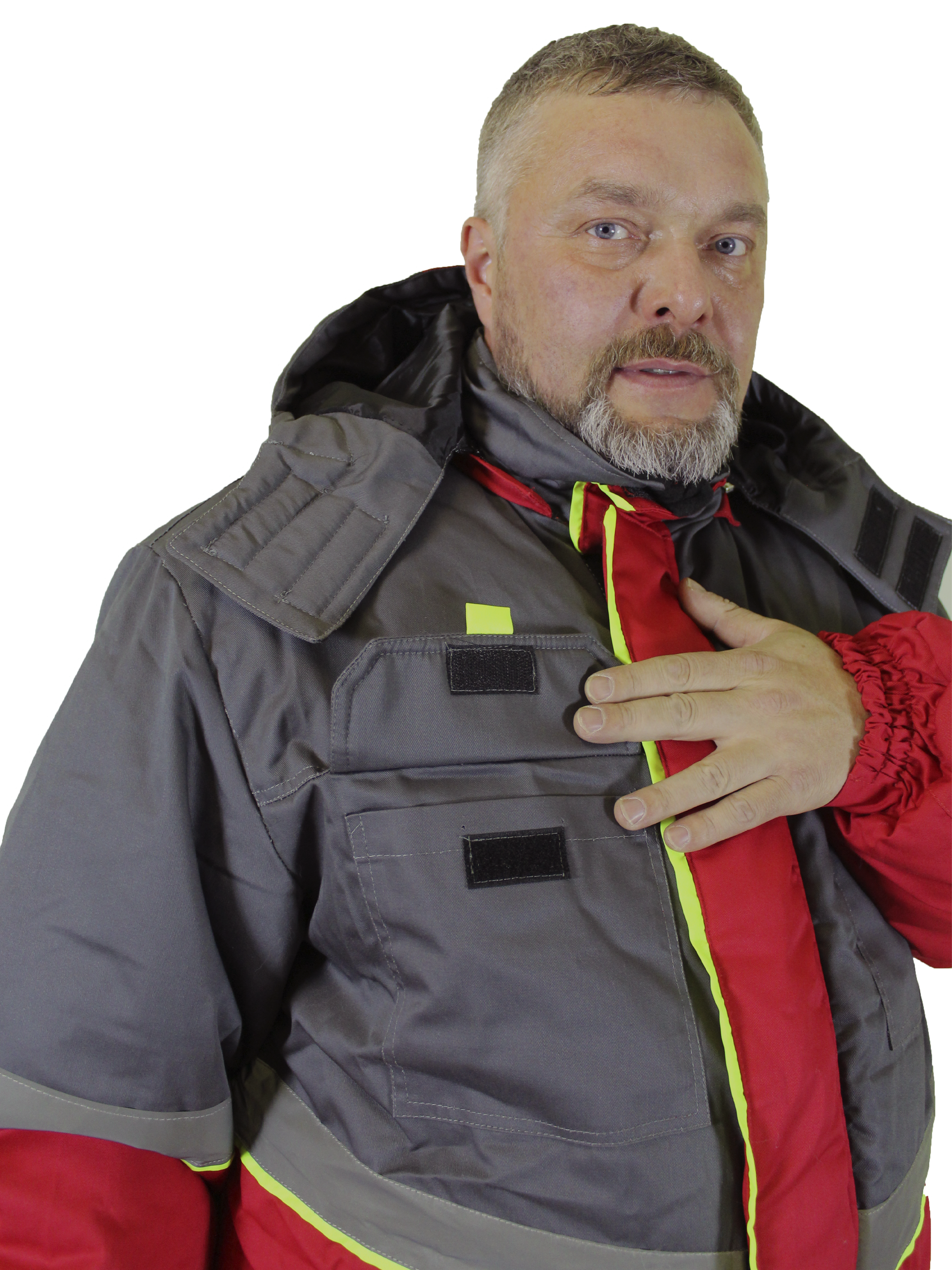 - нагрудные и боковые накладные карманы скошенной формы с утепленными клапанами. фиксирующимися на липучку