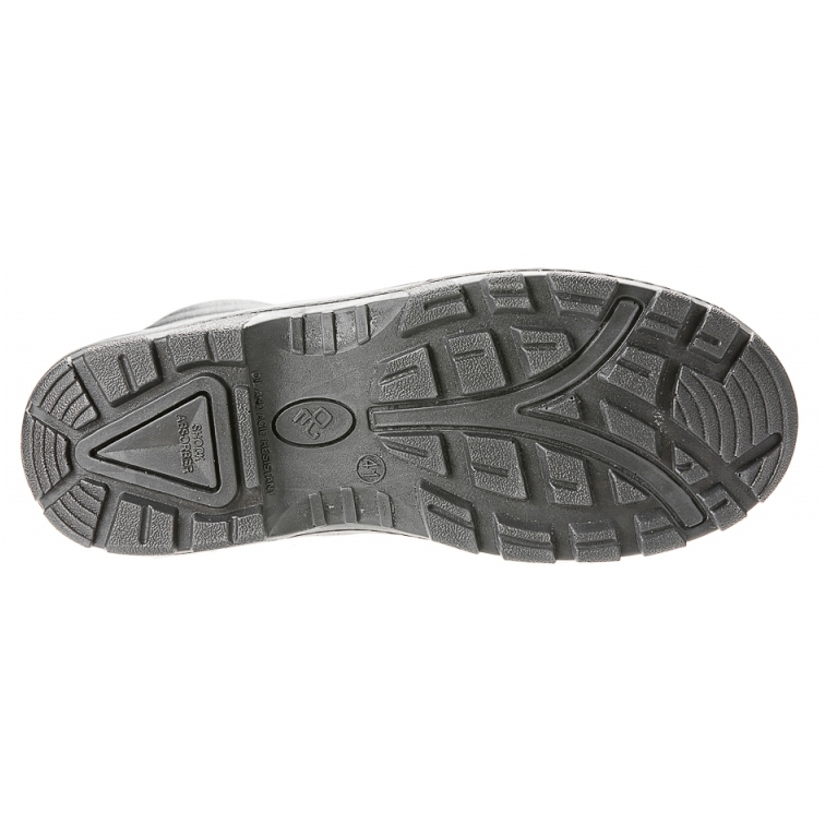 Однослойная маслобензостойкая полиуретановая подошва литьевого метода крепления имеет вставку в пяточной части подошвы, обладающую амортизационными свойствами и способную гасить ударные нагрузки при ходьбе.