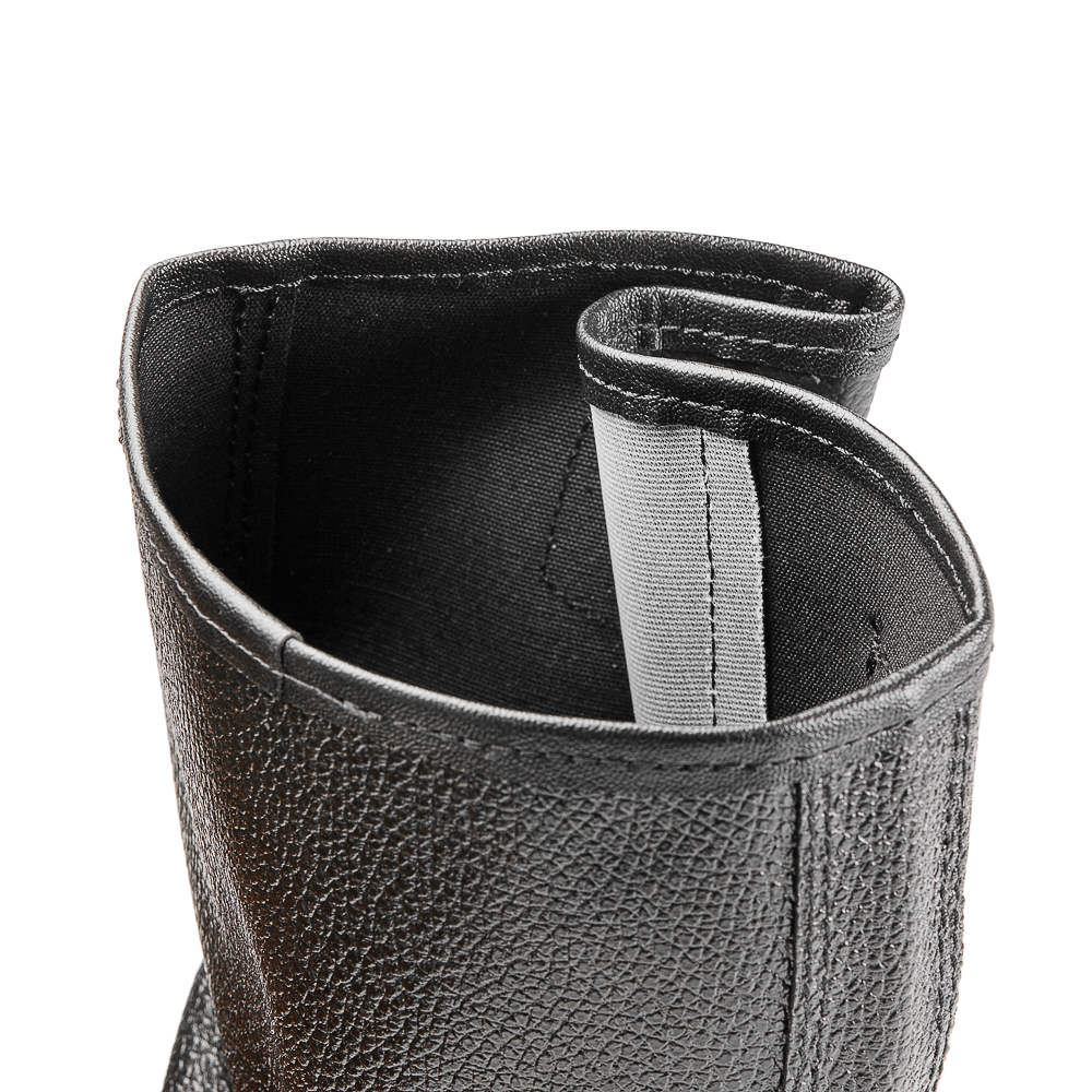 Модель дополнена ремнем с металлической пряжкой для возможности регулировать и комфортно фиксировать ширину бесподкладочного голенища.