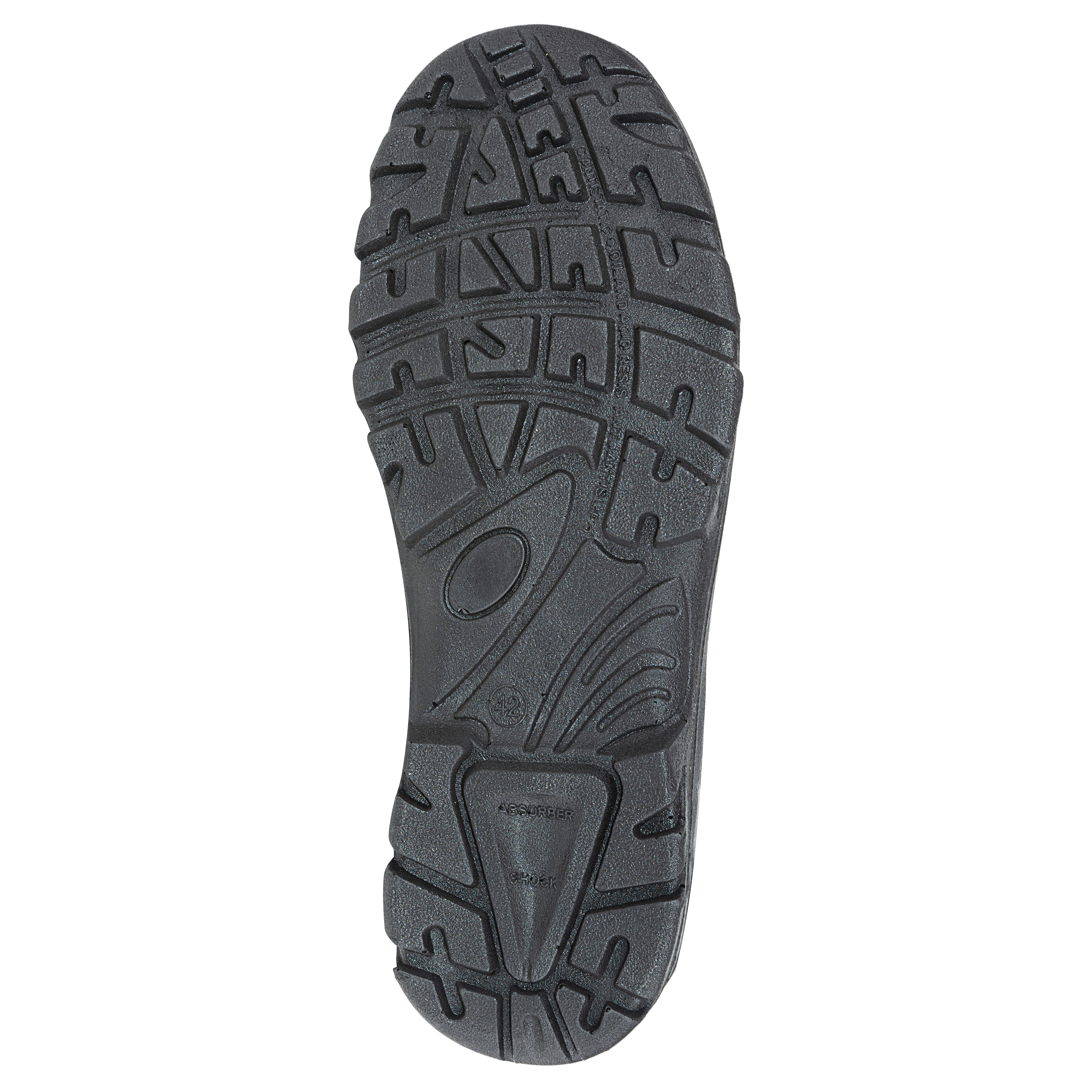 Однослойная маслобензостойкая полиуретановая подошва литьевого метода крепления имеет вставку в пяточной части подошвы, обладающую амортизационными свойствами и способную гасить ударные нагрузки при ходьбе.